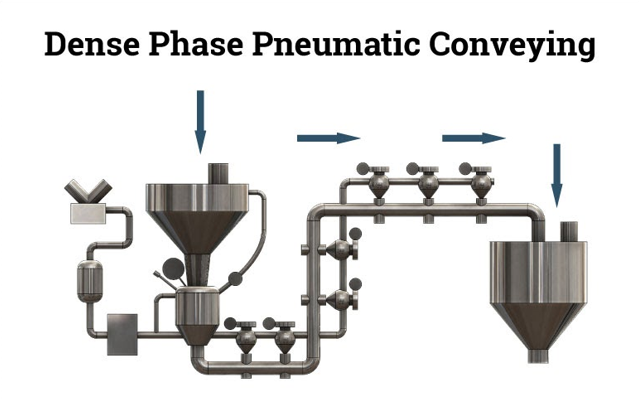A dense phase conveyor is a pneumatic system that moves bulk materials compacted in a slug-like manner, at a lower