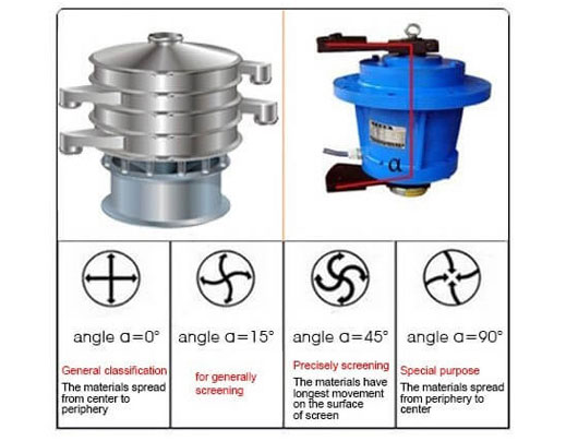 The vibration is accomplished by eccentric weights on the upper and lower ends of the motion-generator shaft. The direction of the eccentric weights can change its rotational mode,rotation of the upper weight creates vibration in the horizontal plane, which causes material to move across the screen cloth to the periphery,while the lower weight acts to tilt the machine, causing vibration in the vertical and tangential planes. The trajectories of materials on the screen can be changed by adjusting the phase angle of upper and lower weights.